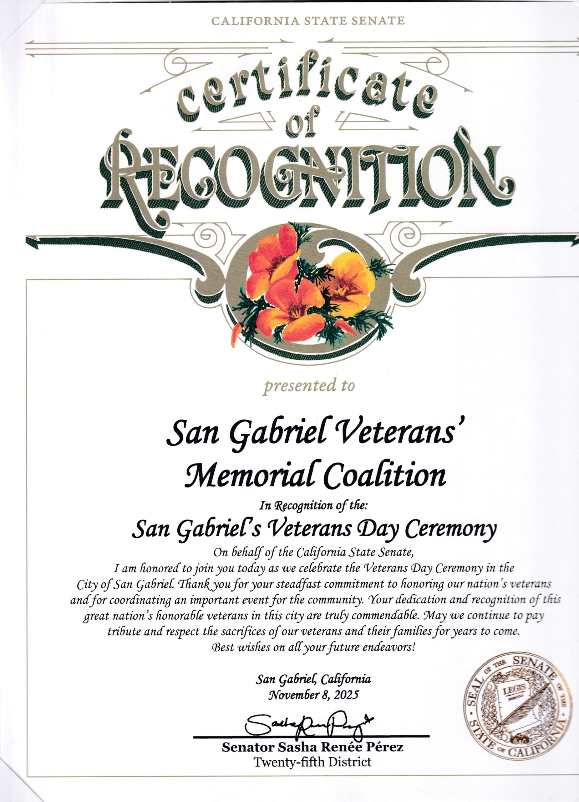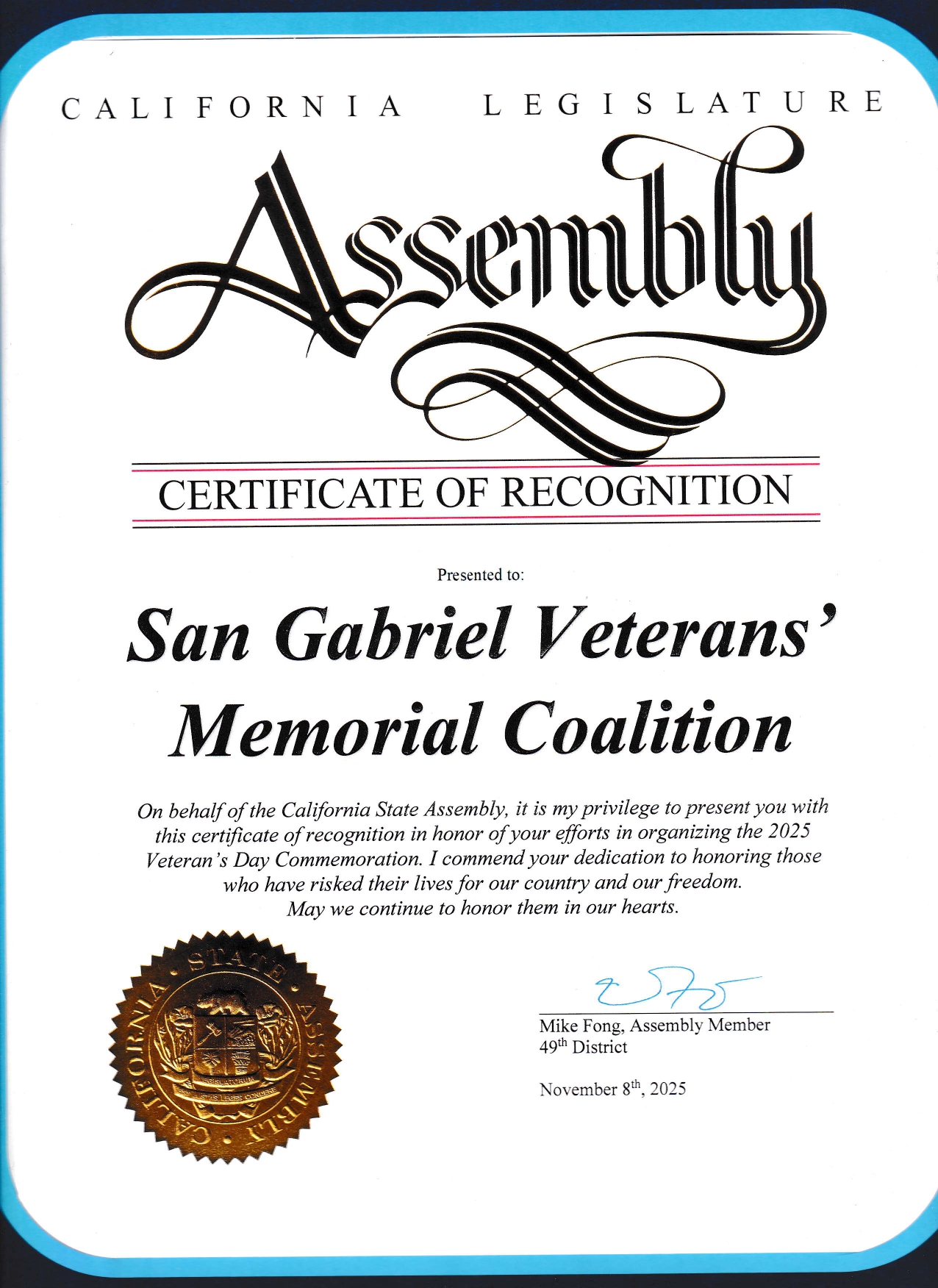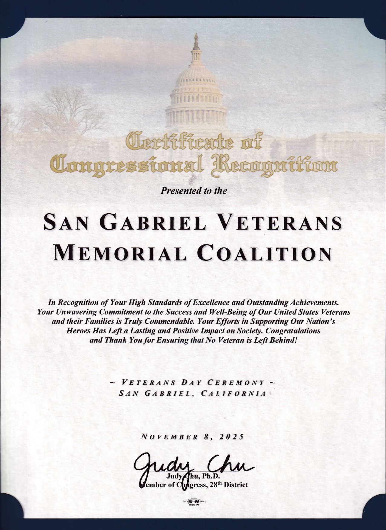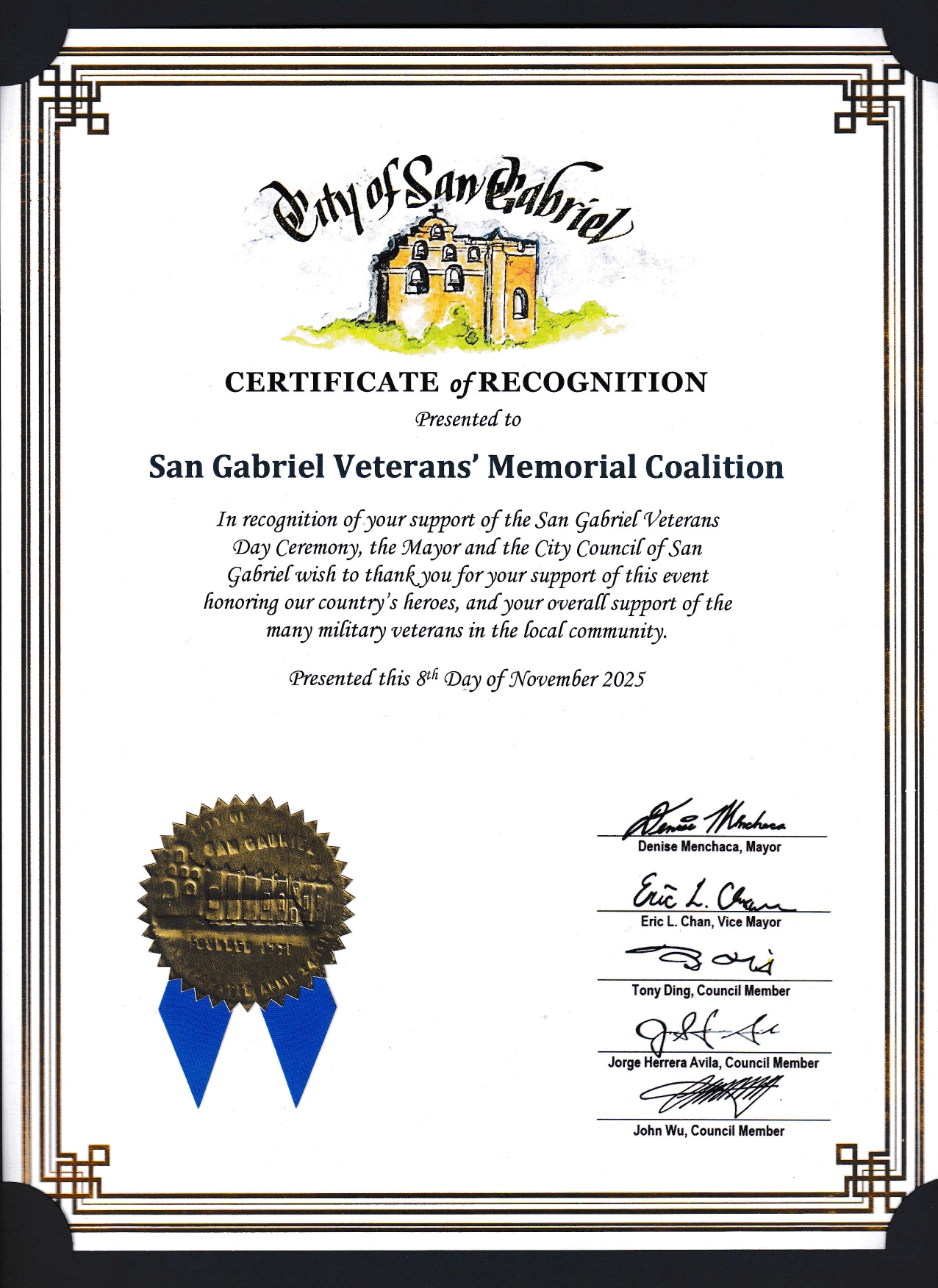 On a Veteran’s Day Ceremony, November 2025, elected officials from the City, State, and our United States Congressional Representatives recognized the San Gabriel Veterans’ Memorial Coalition for it’s efforts to honor Veterans past and present who have served our nation. It is our vision to establish a Veterans’ Memorial monument in recognition of the sacrifices made by our citizen soldiers over the decades.